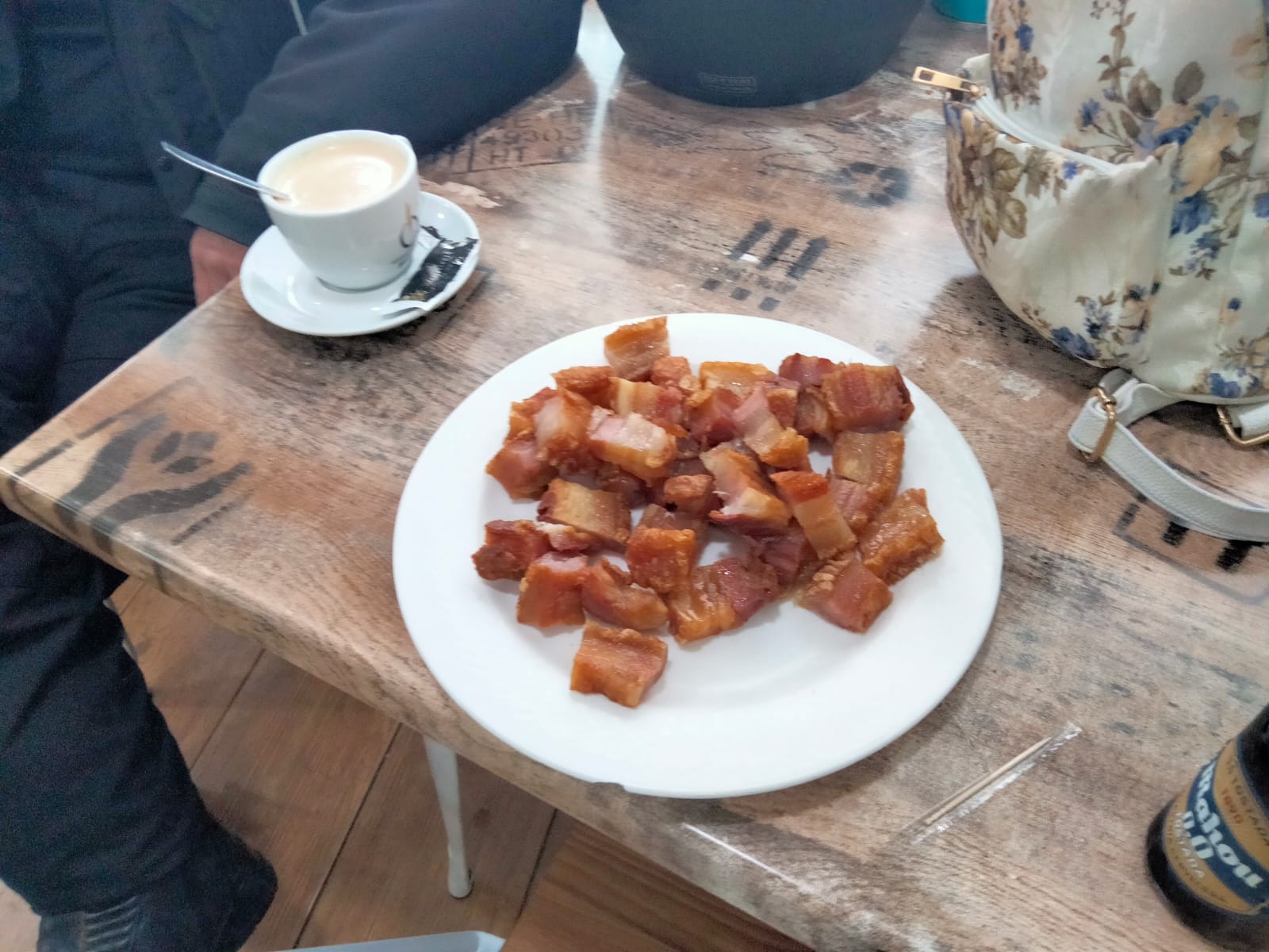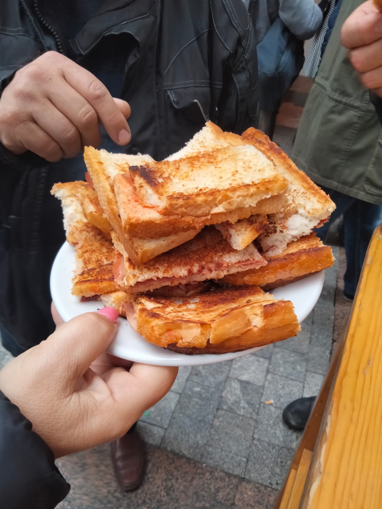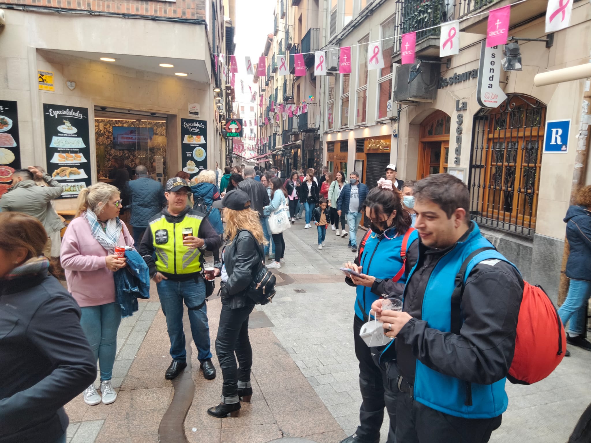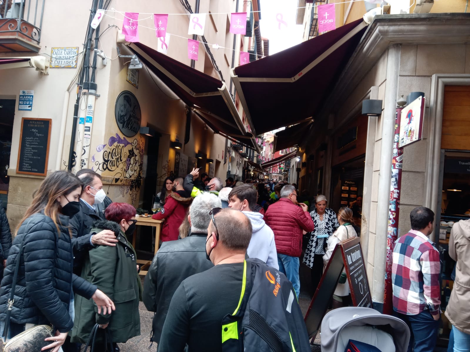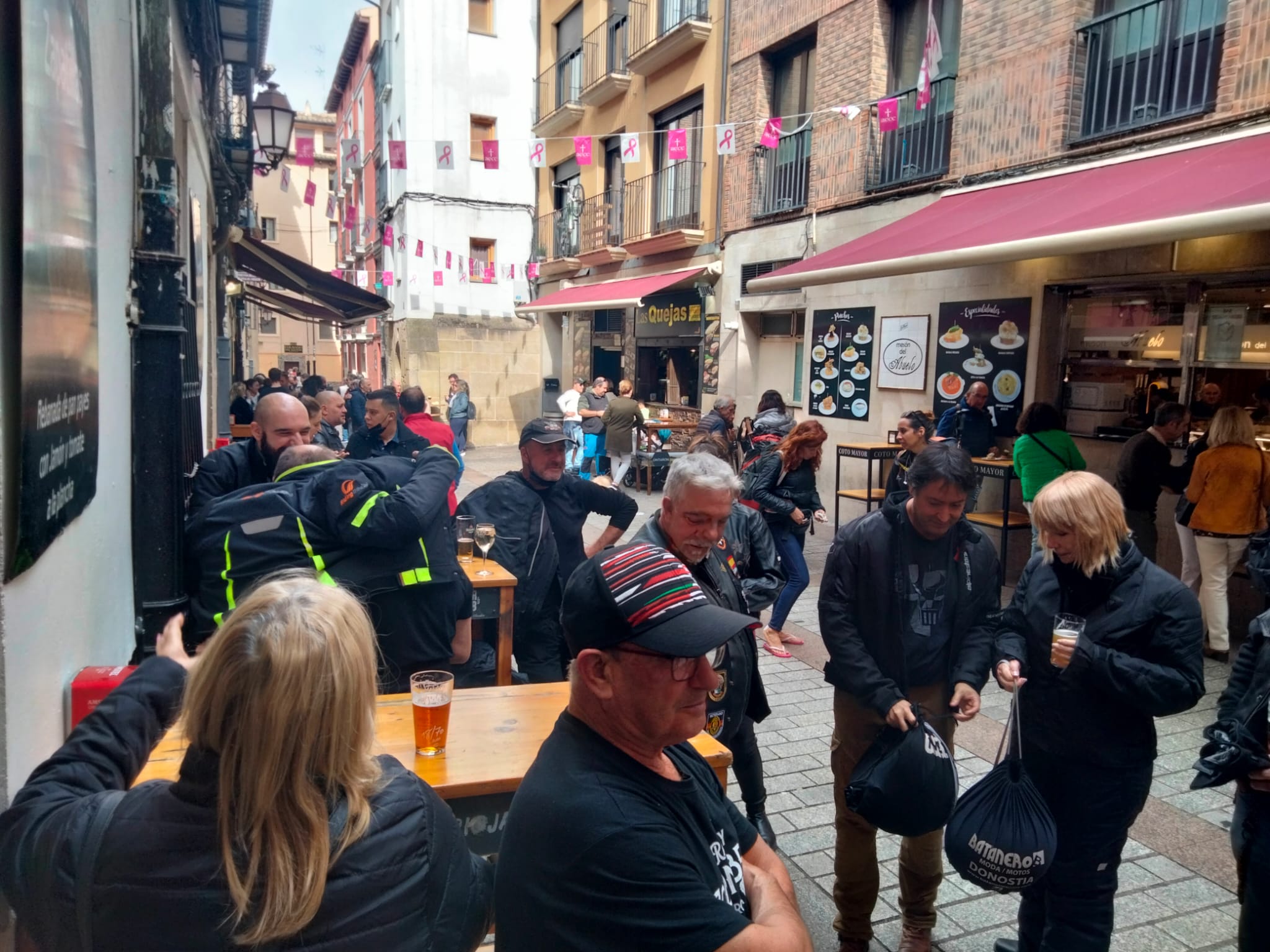 Una vez allí, aprovechamos para cambiarnos las prendas mojadas por la lluvia y tomar unos potes por su famosa calle Laurel, donde comeremos en uno de sus restaurantes.